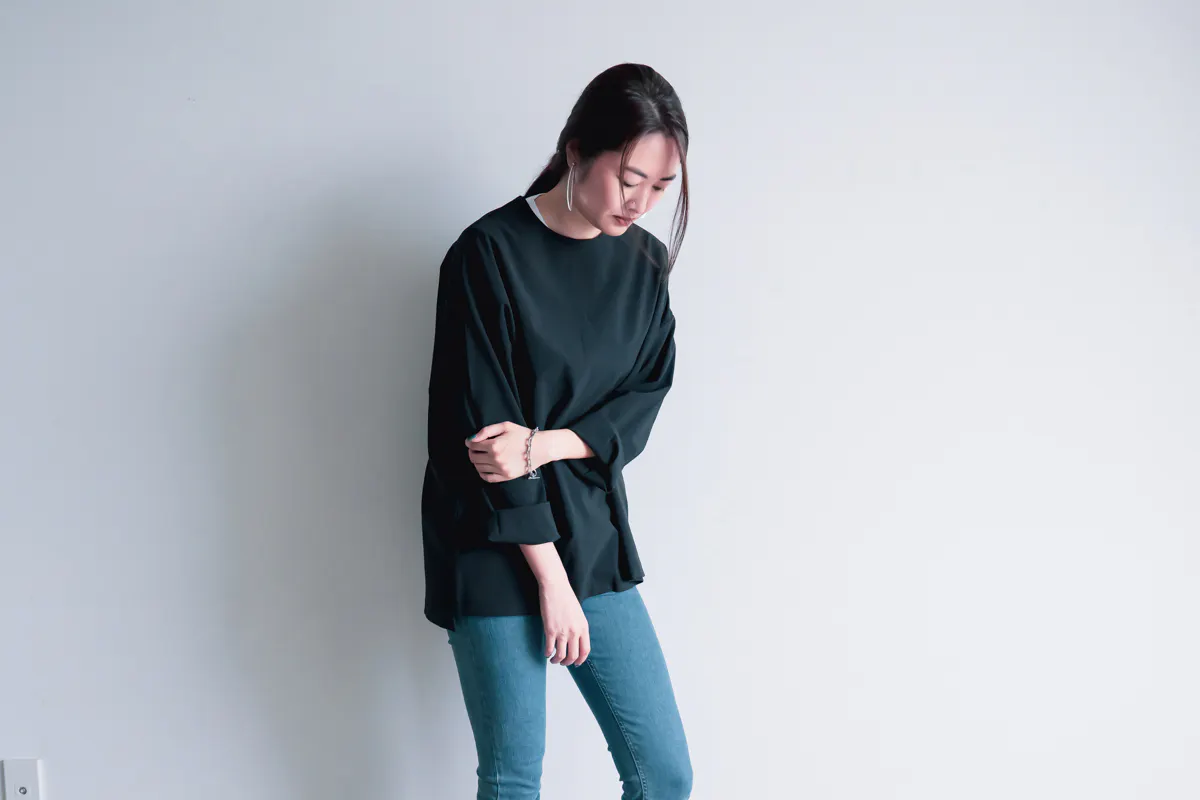 シワになりにくい素材なので、PCのキーボードを打つときや、暑いときはそでをロールして着用ください。