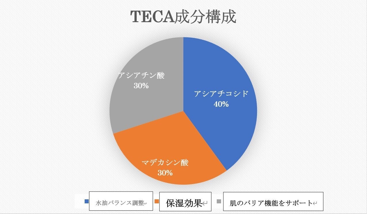 ※TECAとは?ツボクサを精製したエキス一種で、センテラエキスを特殊な技術で抽出した成分。ツボクサエキスの中で最も有効成分の値が高く、水が含まれていないのが特徴。