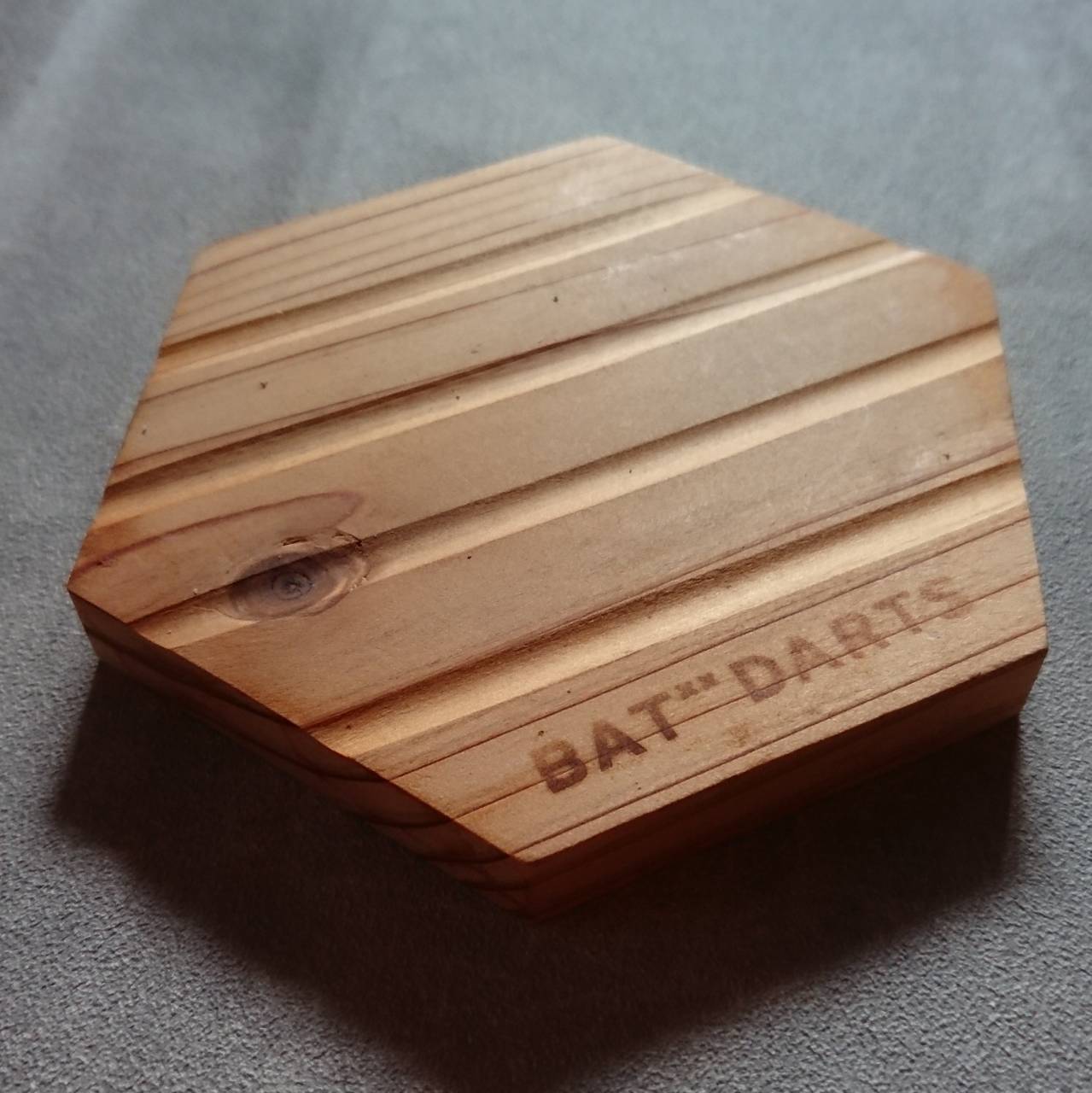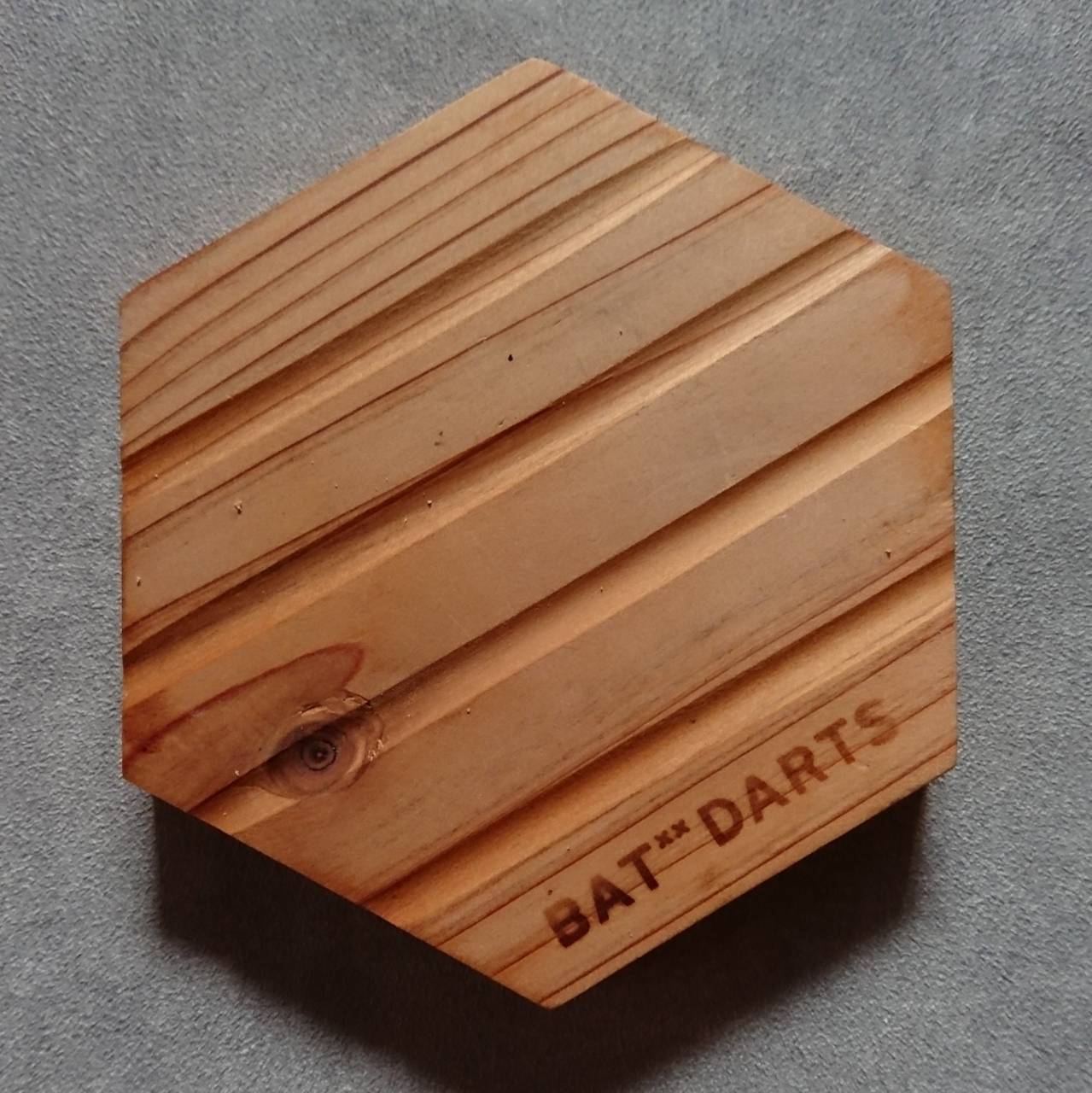 お店で使う「BAT DARTS」と焼き印が入った木製の六角コースターです。