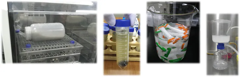 肌への安全性や、環境負荷低減の観点から、有機化合物やアルコールを一切使用しない製法を確立しました。魚皮なので、脂や臭いが気になる点でした。そのため、コラーゲン抽出前に脂をできる限り取り除く工程を入れたり、最後の精製工程でも工夫を施したりし、飲めるほど高純度のコラーゲン溶液の抽出に成功しました。