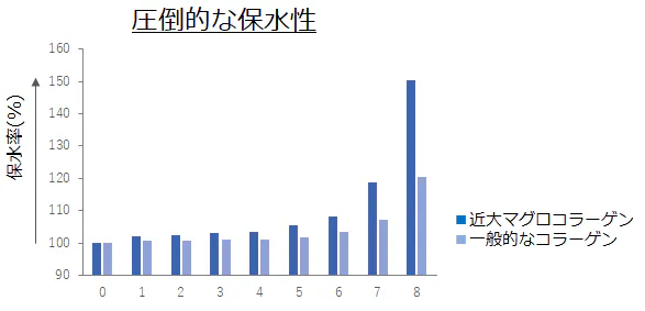 近大マグロコラーゲンの保水性(水を抱え込む能力)は、一般的なⅠ型コラーゲンよりも約2倍ほど高い結果が得られました。時間が経過するほど、保水率の差が開いていきます。スキンケアの瞬間だけでなく、潤いを持続させる成分として期待されています 。