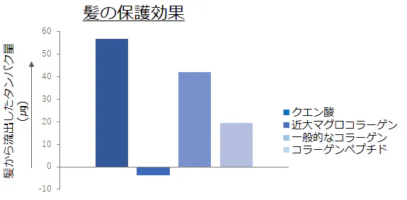 近大マグロコラーゲンは髪表面へのなじみも良いと考えられ、毛束を使った実験では、髪からタンパク質が流れ出るのを唯一防いだ結果が得られました。