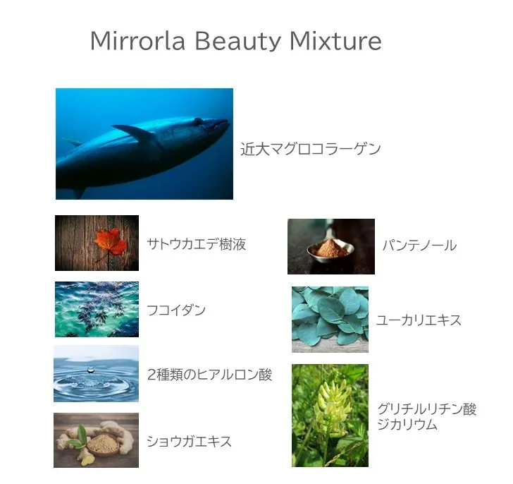抽出・精製方法が新規的であり、Mirrorlaでは、近大マグロから抽出したフルレングスコラーゲンを使用しています。