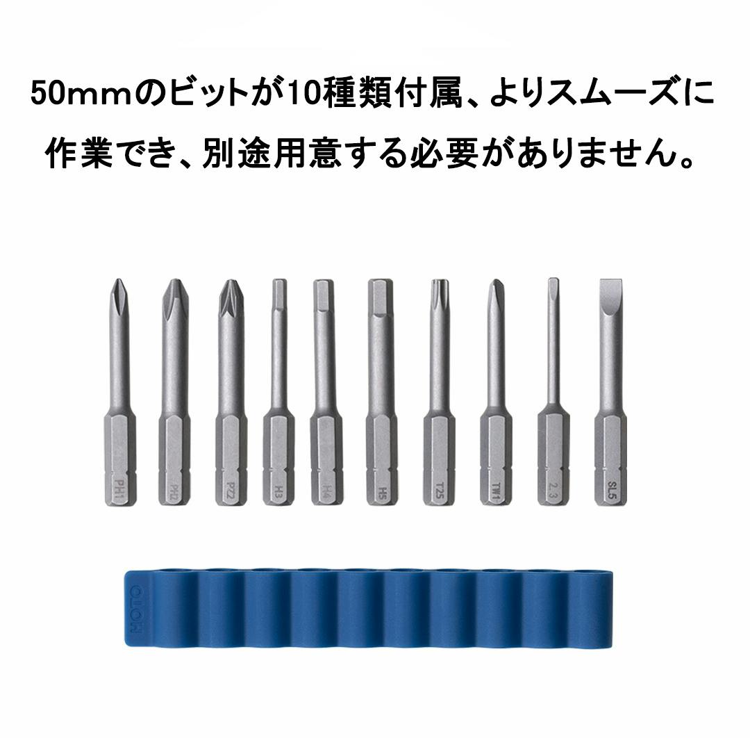 電灯なしでも暗くてネジ穴が見にくい場所での作業は簡単になります。手元をしっかり照らしてくれるので、昼夜を問わず作業が可能です。初心者にとても使いやすい親切設計です。ドライバー付属品10本鋼製ビットが搭載されており、様々なシーンに対応できます。