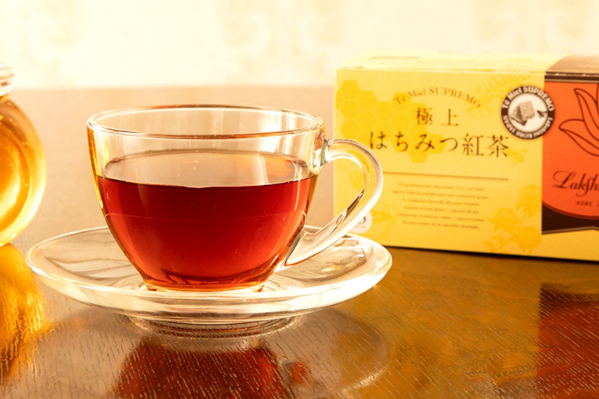はちみつの味と紅茶の香りがバランスよく混ざり合うこと…そのために紅茶ソムリエが納得いくまで何度もテイスティングを行い、味や香りに癖のない細かい茶葉を厳選しました。茶葉はとても繊細で、気候などの影響で大きく味が変化します。ラクシュミーでは生育条件に左右されないよう高いクオリティの味と香りを保つため、インドやアフリカなど数か国で採れた茶葉をブレンドしています。茶葉の優しい香りと紅茶特有の渋みや苦みなどを活かす、ふんわり甘いはちみつの後味、見た目にも美しい透明感のあるオレンジ色、これらを実現するため紅茶ソムリエが何度も試行錯誤をした結果、はちみつと紅茶の最高のマリアージュが楽しめる逸品が完成しました。