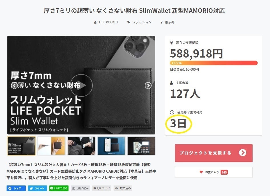 このたびは「新型MAMORIO対応!厚さ7mmの超薄い なくさない財布Slim Wallet」のプロジェクトにご支援をいただき有難うございます。プロジェクトのスタートから、3日目で目標金額を達成する事ができました!チーム一同、皆様の心暖かいご支援に大変喜んでおります。本当に有難うございました!プロジェクトも、まだ38日ございます。ご賛同とご支援を頂きました皆様の想いを胸に、「新型MAMORIO対応!厚さ7mmの超薄い なくさない財布Slim Wallet」を盛り上げていきたいと思います。LIFE POCKETプロジェクトチーム 三木