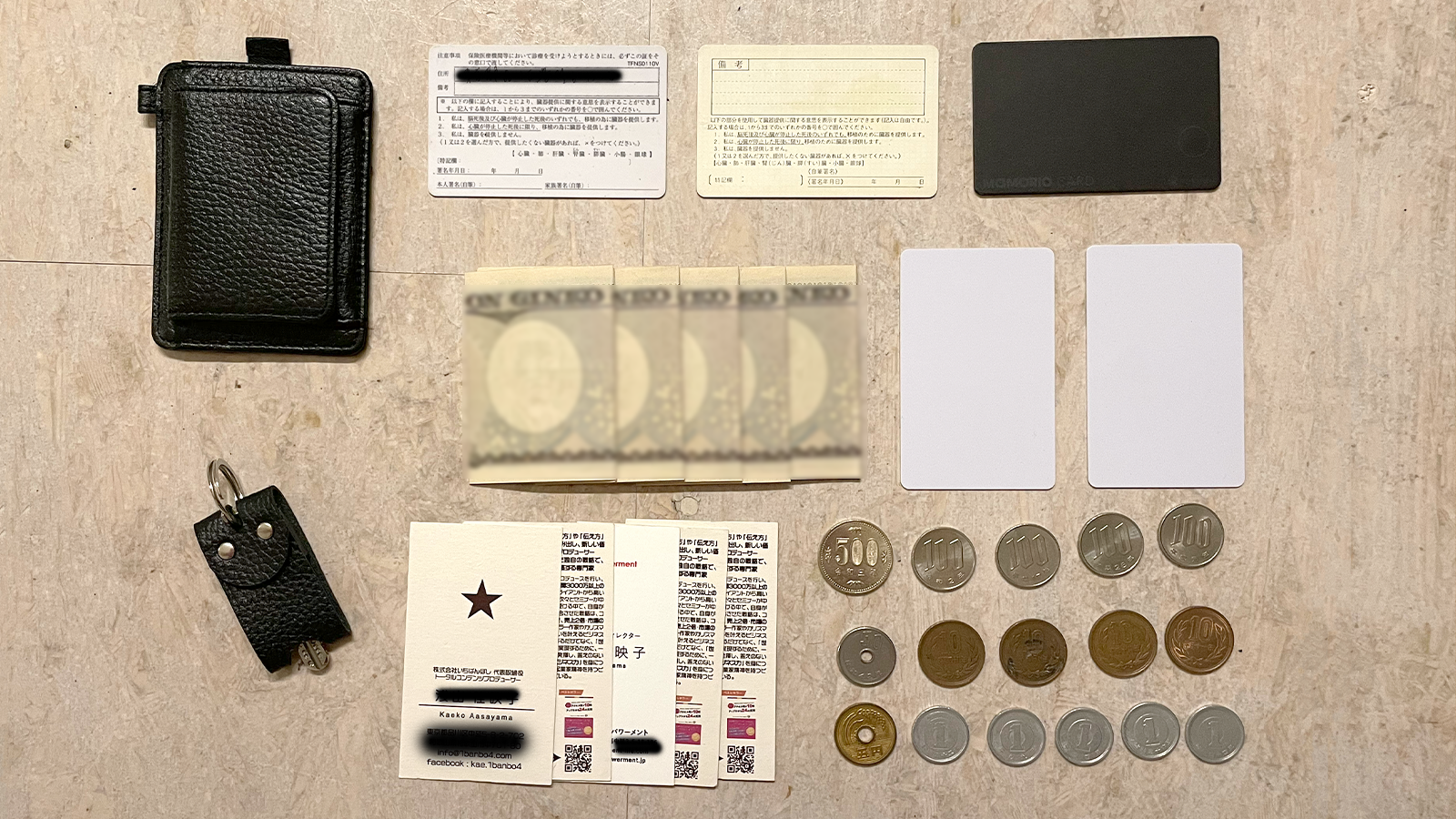 クレジットカードやキャッシュカード、Suica、運転免許証、保険証、名刺、Mamorio…日常生活で必要なものは、ちゃんと持ち歩けます。
