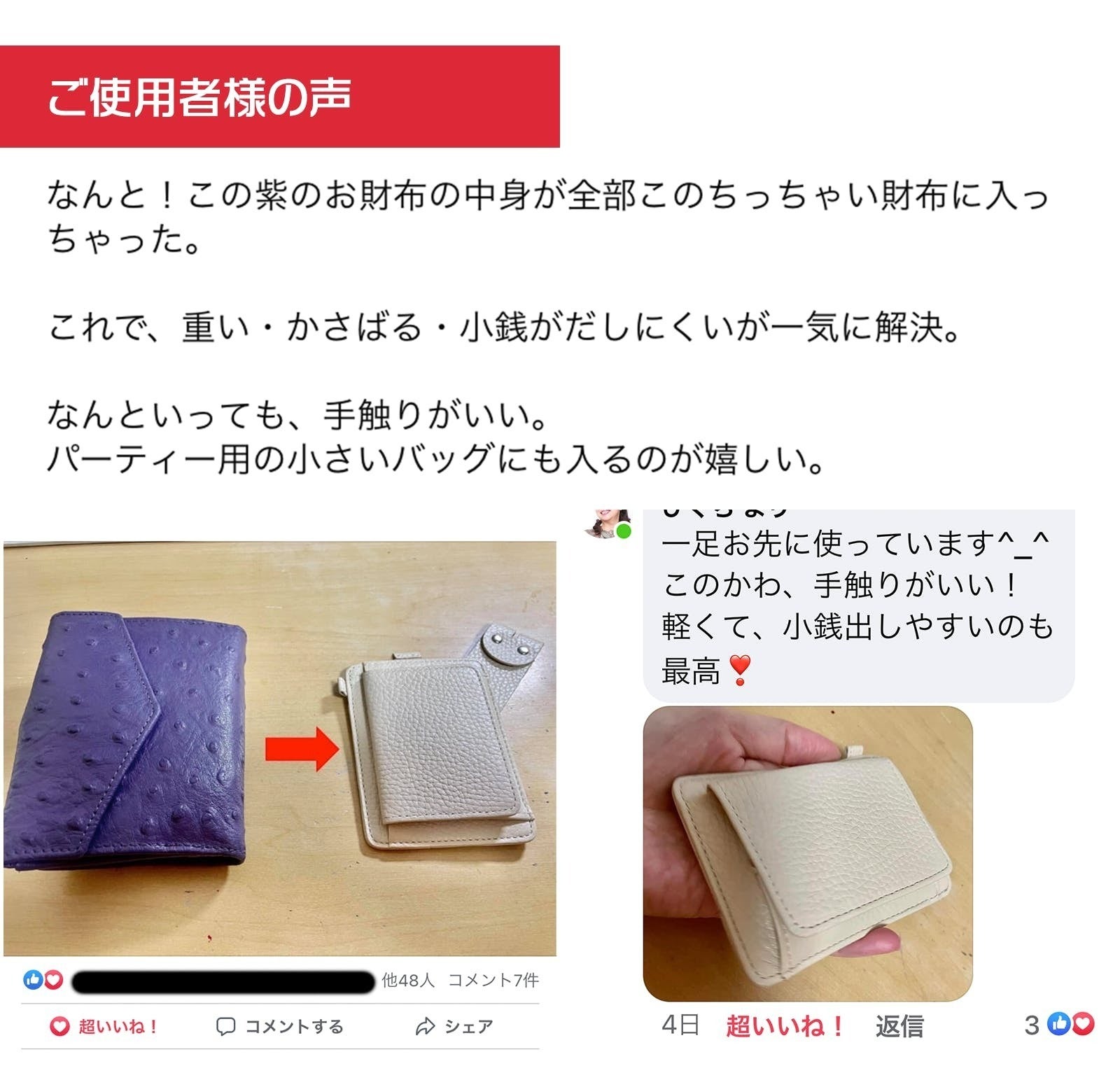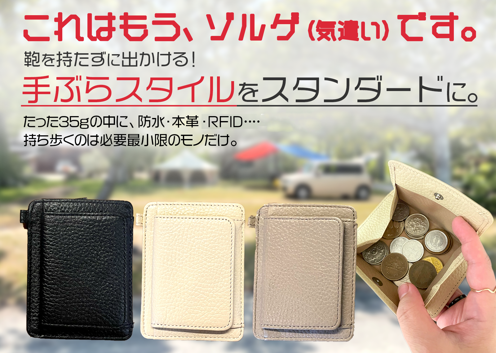 アウトドアでも使える革財布が見つからないので、防水・本革、とにかく軽く・薄く・小さく・便利に!をコンセプトに、女子キャンパーが理想の財布を開発しました。