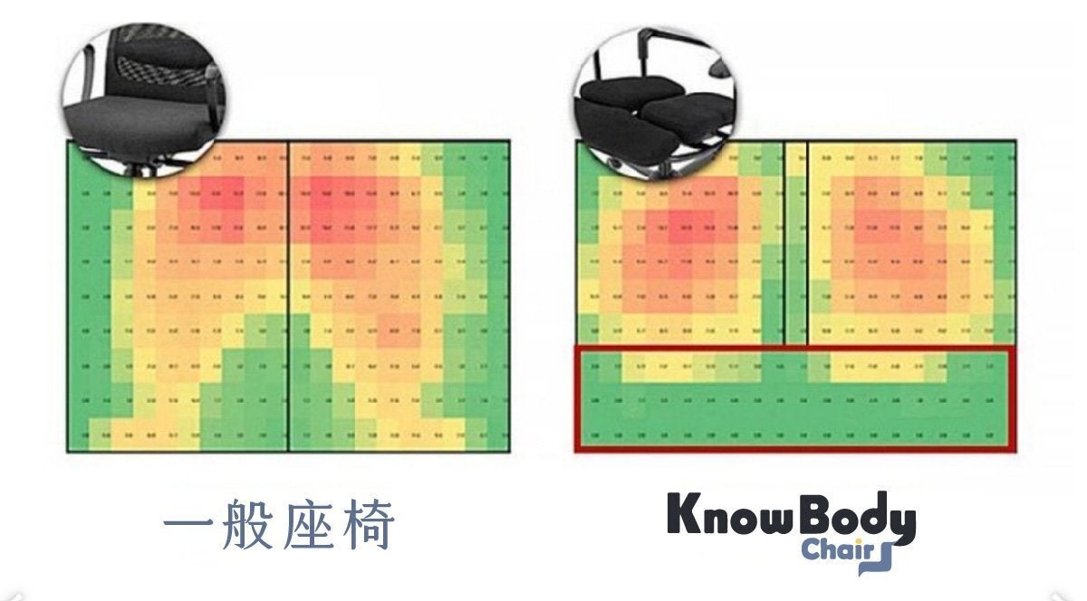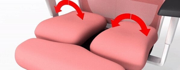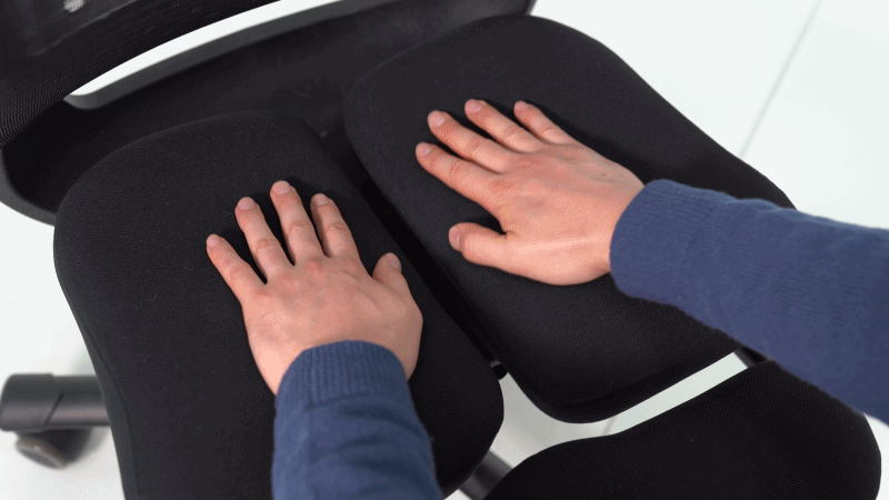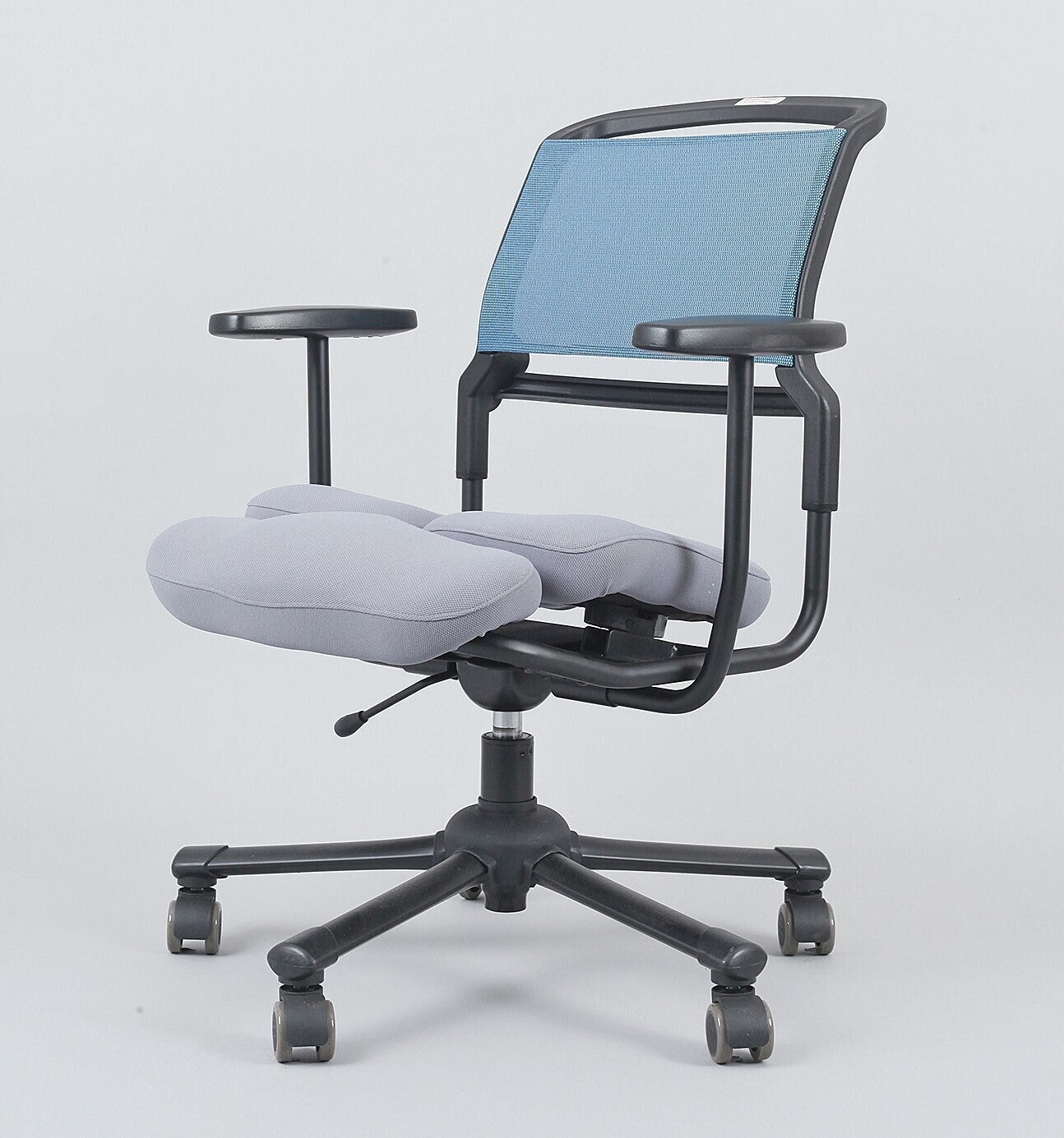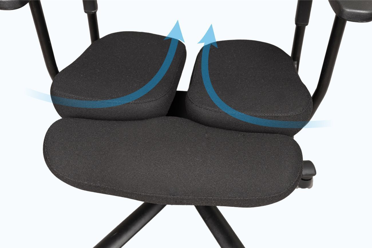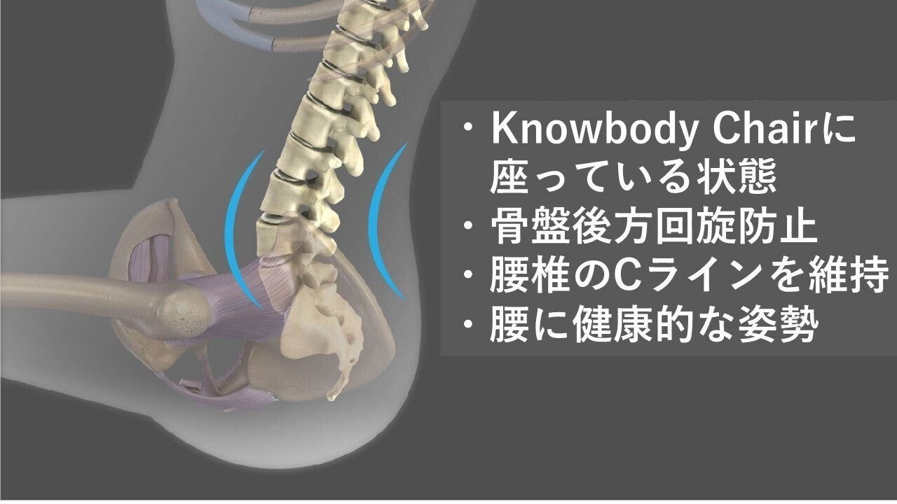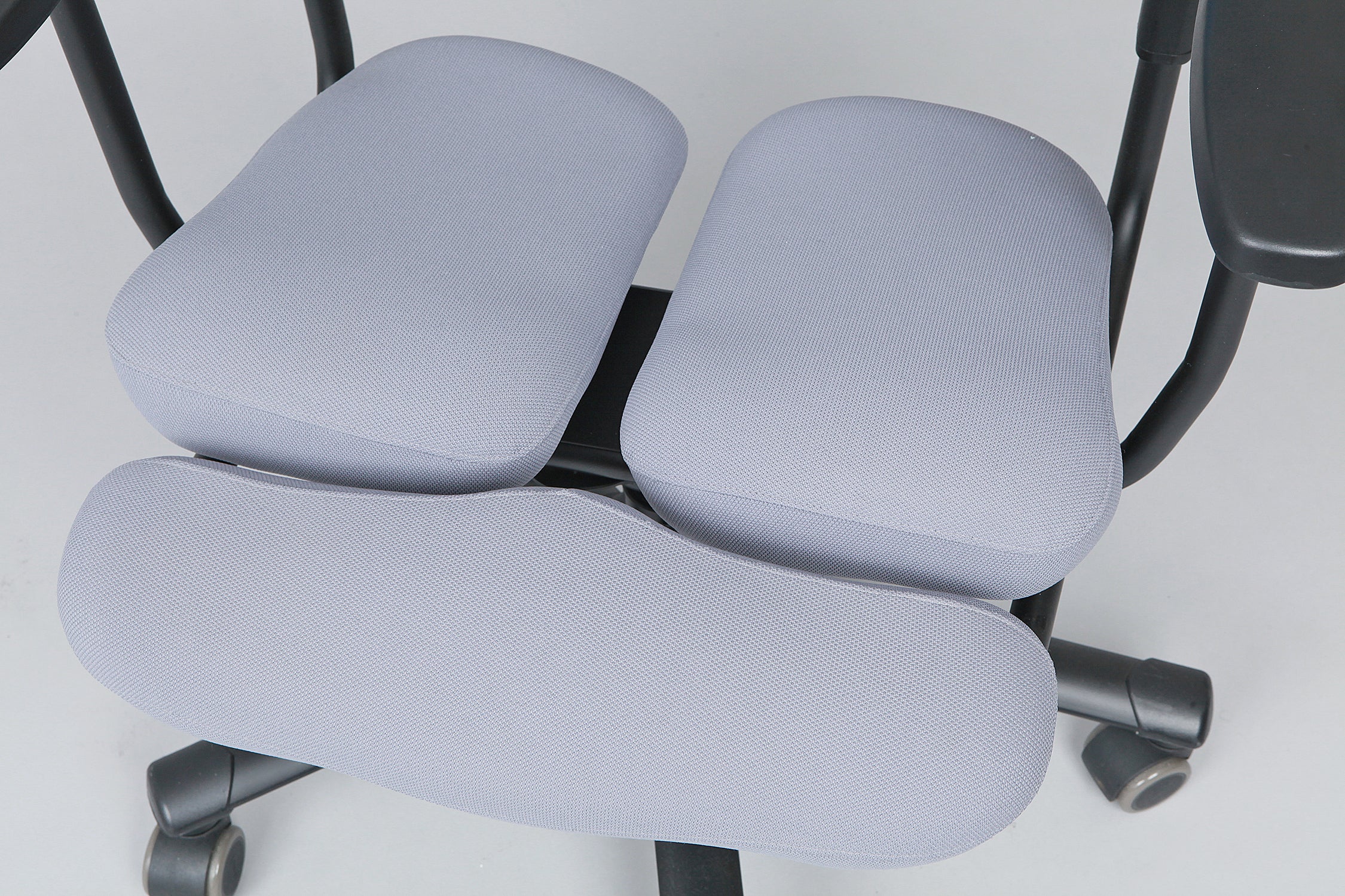 3分割された流動的な座面が骨盤の後方回転を防止します。分割された座面によって腰椎のCラインが維持され、腰の負担が軽減されます。Knowbody Chairに座ればあなたの骨盤は無意識に 正しい姿勢を維持してくれます。