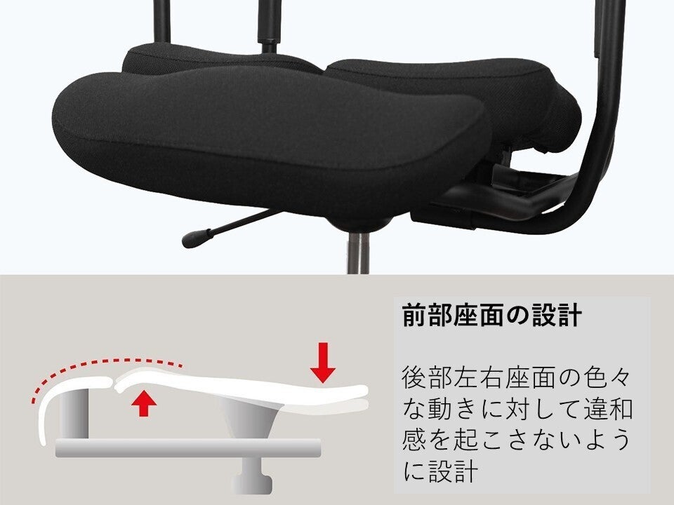 前部座面は流動座面のすべての動きと調和するように設計されました。骨盤の位置と同じくらい足を支える筋肉も重要です。そのため数多くの実験を経て、最適な位置と曲率を選定しました。
