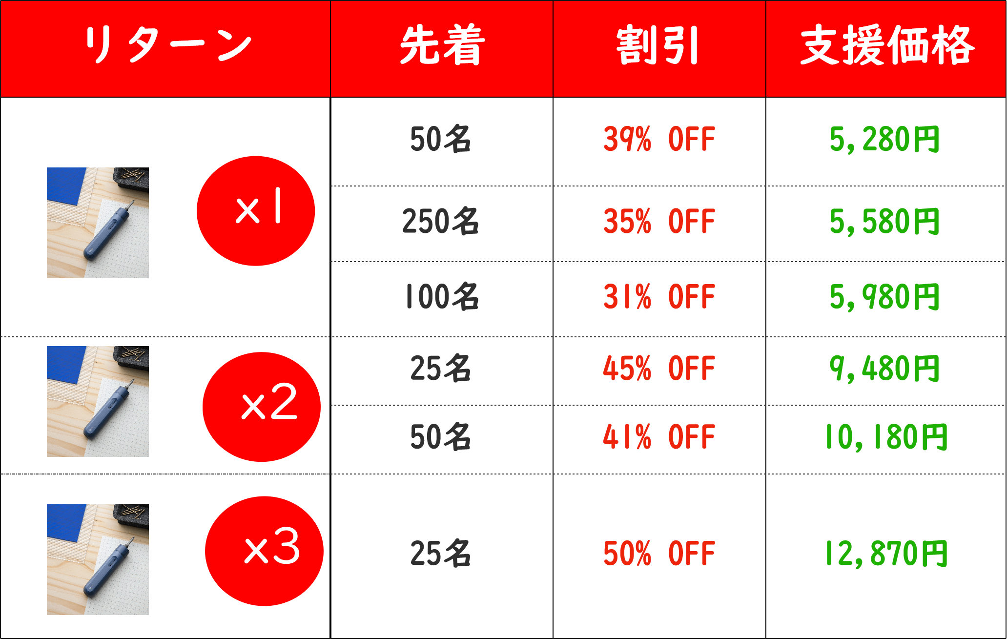 ※想定を上回る皆様からご支援を頂き、量産体制を更に充実させることができた場合、一般販売価格が予定価格を下回る可能性がございます。