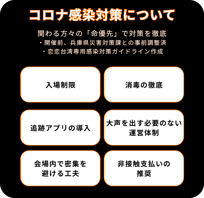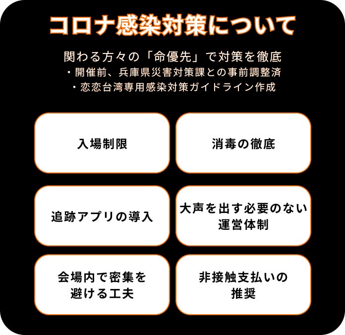 ※2021年10月22日現在、兵庫県・神戸市よりイベント開催時の感染対策条件が更新されました。最新の対策ガイドラインをもとに感染対策課に相談をしながらイベント準備を行っております。