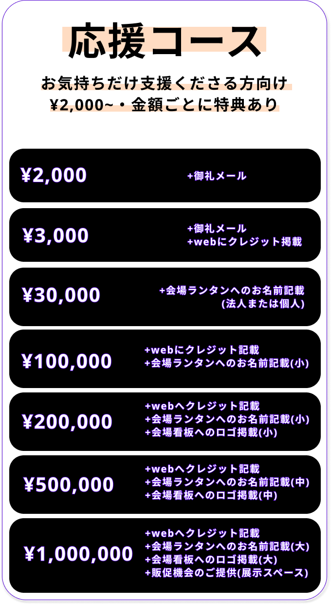 より多くのご支援をいただけるたびに会場設備を充実させられるので、一層のご支援をお願いします..!
