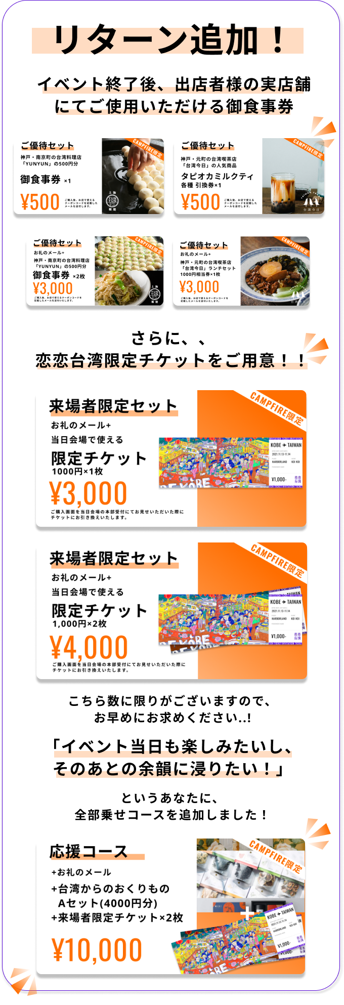 また、恋恋台湾にてご使用いただける来場者限定チケットをCAMPFIRE限定で提供いたします!記念として飾るもよし、次回の恋恋台湾に持ち越すもよしです!ぜひお手に取ってください!