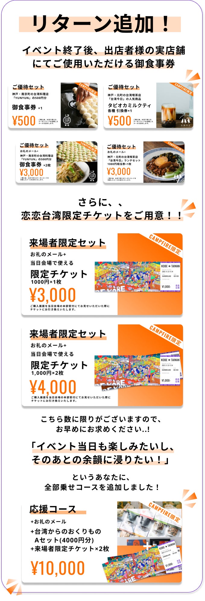 ご優待セットに協力いただいた店舗は、神戸で多くの方に愛される「YUNYUN」さん、「台湾今日」さんの2店舗!今回の恋恋台湾のコンセプトに共感いただき、店舗で使える御食事券をリターンにご提供いただけることに〜〜!(筆者は個人的にケンミン坊やファンなので、嬉しいです。。。)