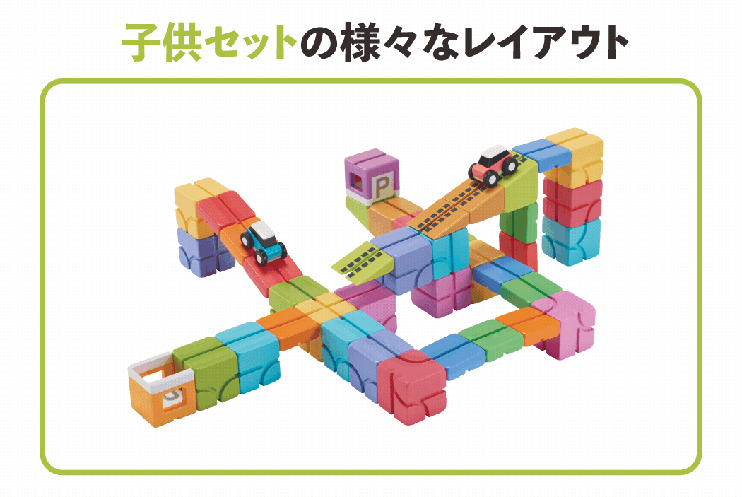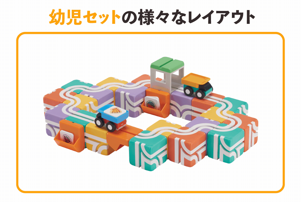 レールの位置を考えながら組み立て、自分の思った通りに車を走らせると大きな達成感を味わうことができます!子どもの自信がぐんぐん育ち「自分で考える」力も促進。