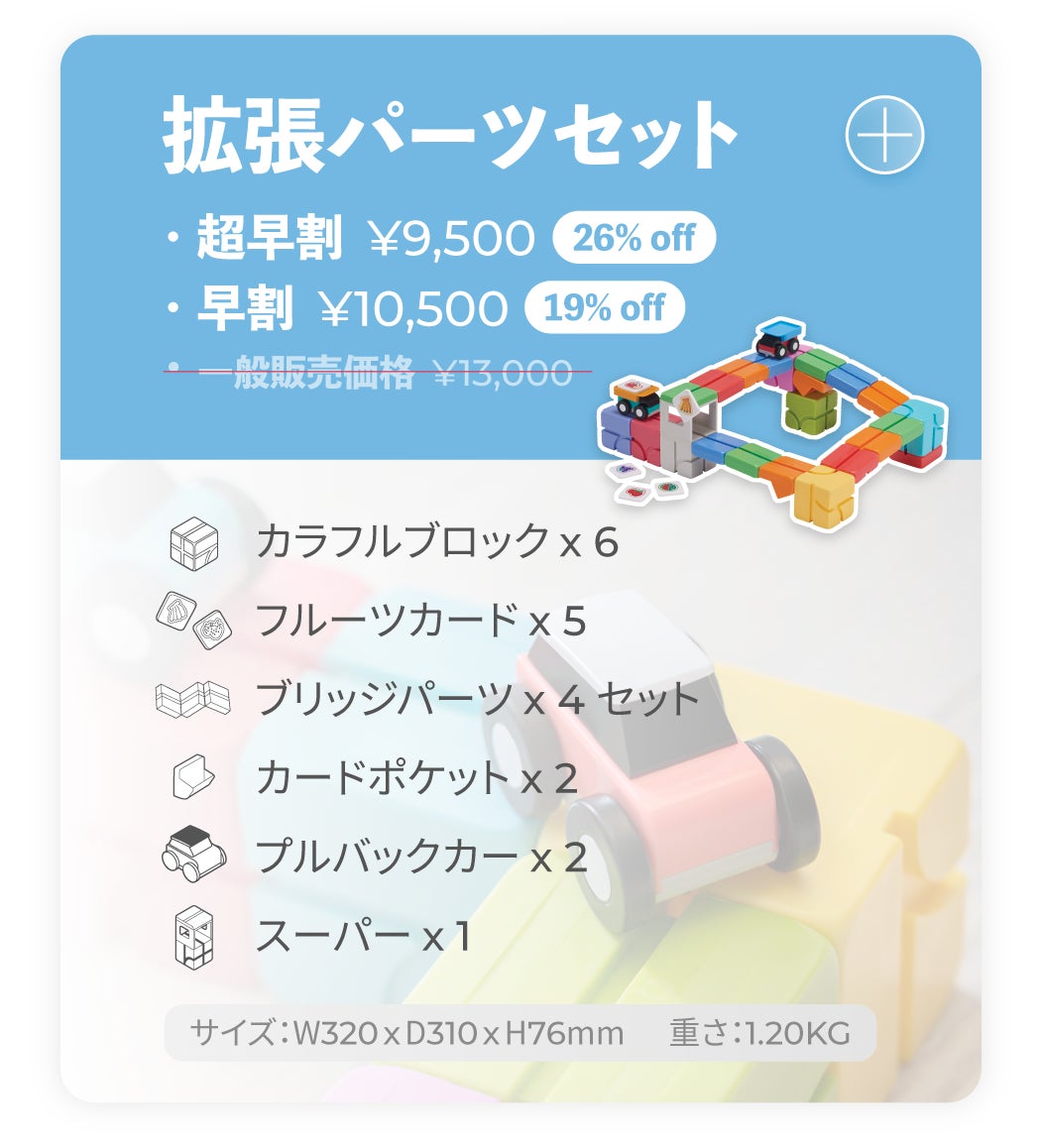 A:本キャンペーンでは、 セットのみを販売しております。 クラウドファンディング終了後、 パーツや車単体での追加購入を導入する予定となっております。出来上がり次第、Qbiのインスタにてご紹介いたします。最新情報を見逃さないように、ぜひフォローよろしくお願いいたします。