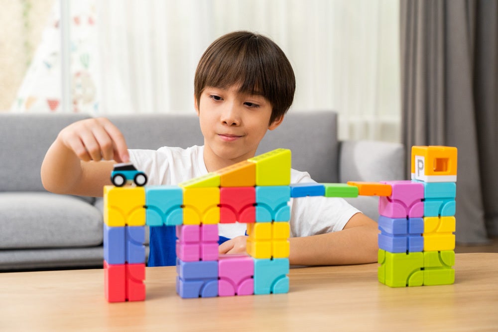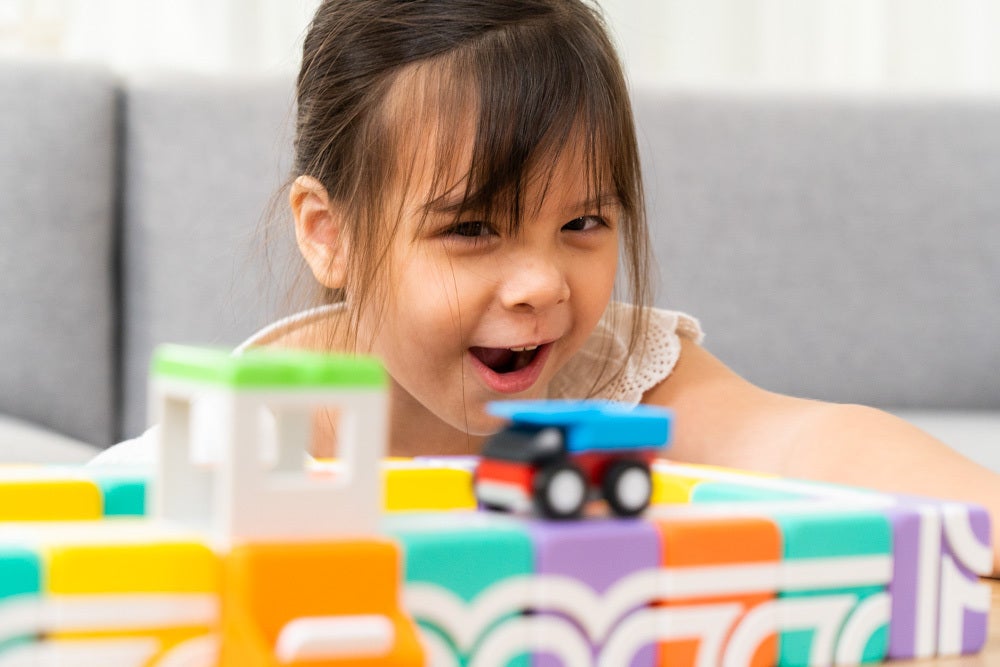 A:Qbi Toyはご家族と一緒に1歳前後の子どもでも安心して遊ばせるようにデザインされています。1歳児はブロックを積むことで、手を器用に動かす練習にもなり、 カラフルなブロックで子どもの色彩感覚も育みます。大きくなると、車の動きを見ることで、動体視力を鍛えます。