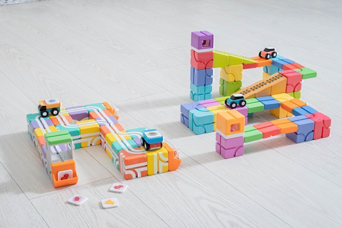 ブロックの6つの面にあるレール(直線、カーブ、交差点など)を組み合わせて、100通り以上のコースを作ることが可能。マグネットでくっつけられる簡単な仕組みで、小さなお子様も直感的に遊ぶことができます。