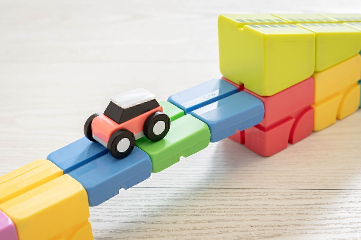 自分の手を使って組み合わせ、レールの上を自由に動く車を見て思考力がUPします。