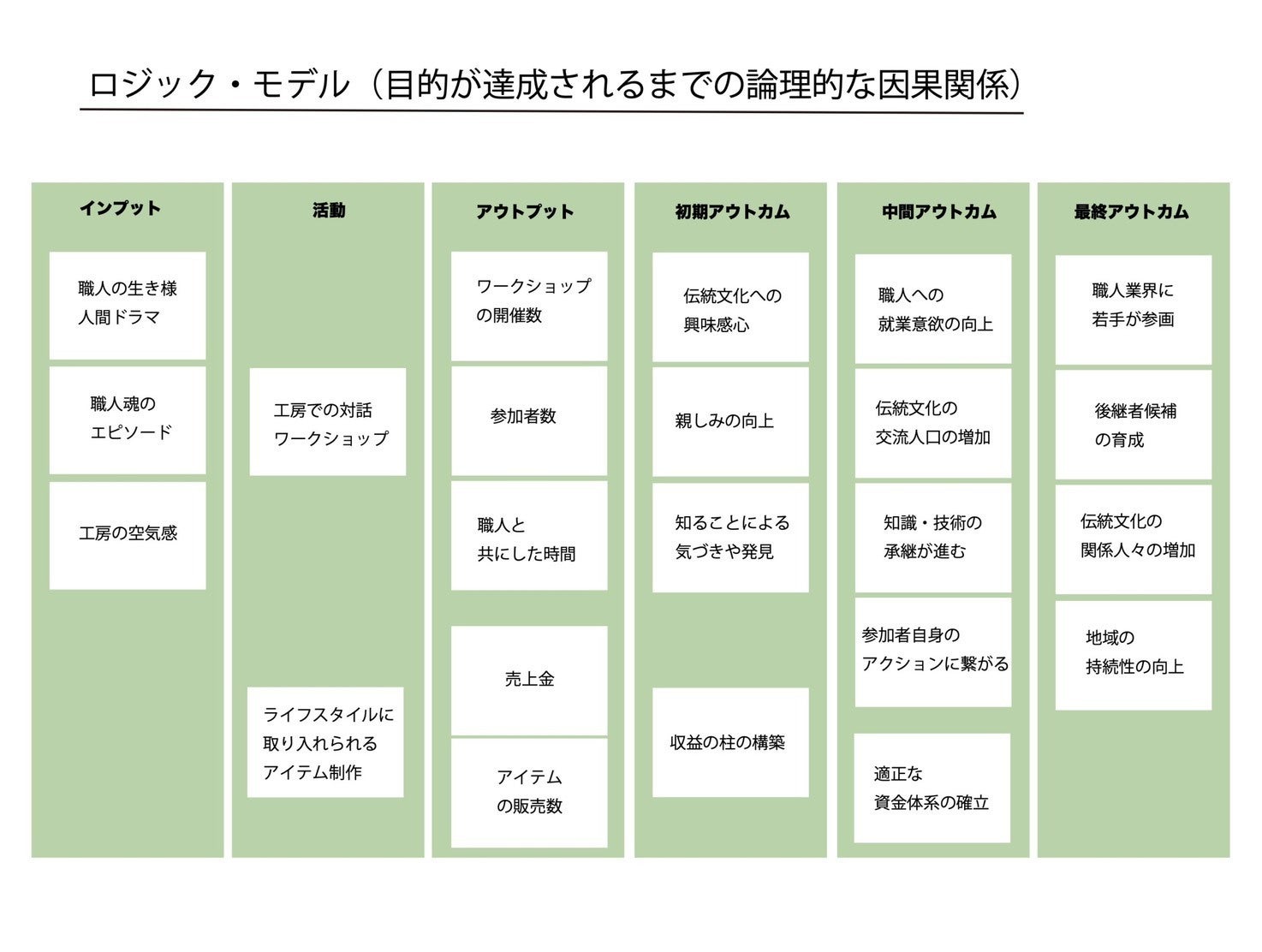 今回のプロジェクトでは、工芸の世界との関わりが増えていくことで、どういう未来をつくっていけるかを社会的インパクトのロジックモデルに沿って遂行・検証していきます。