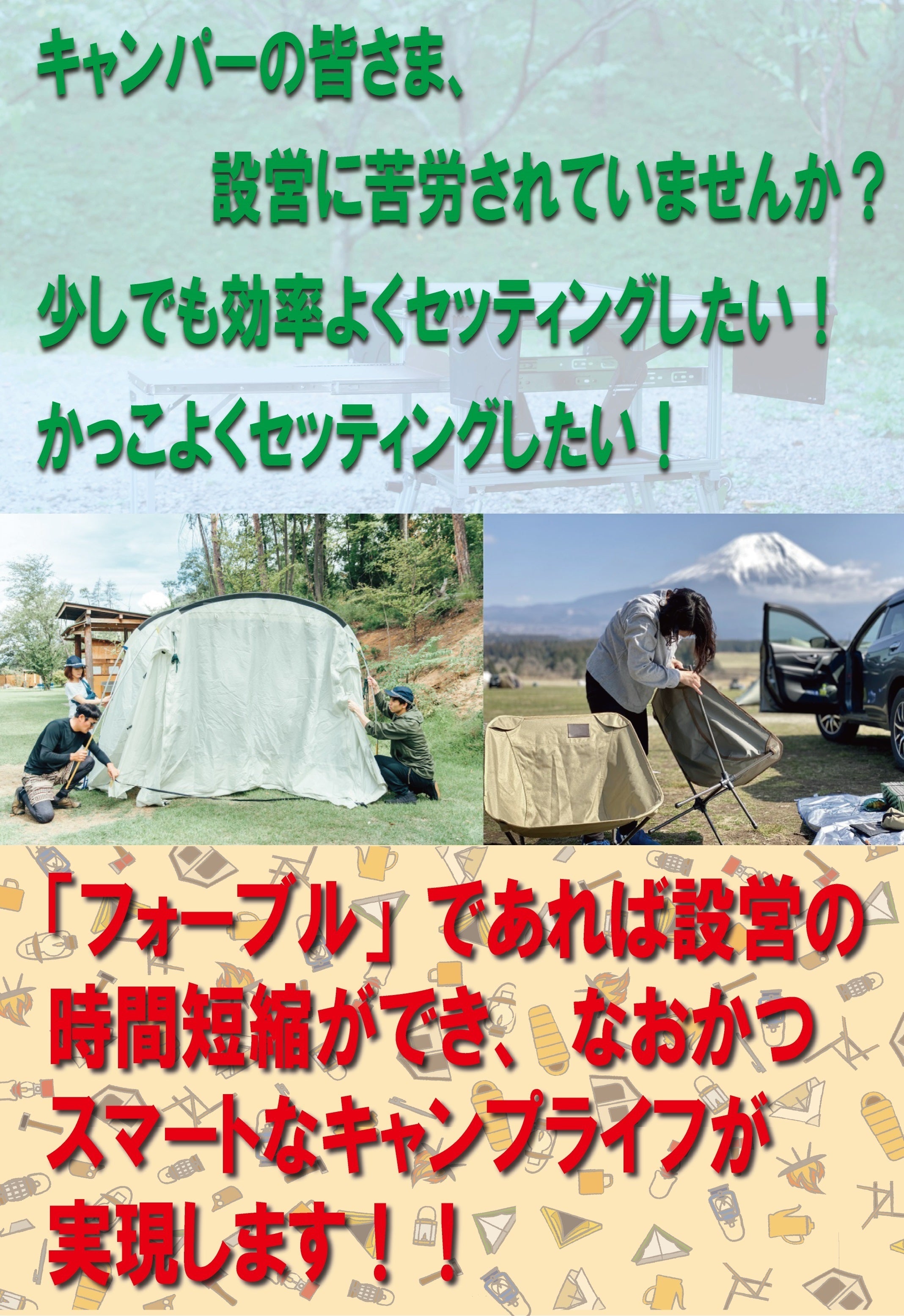 このフォーブルを販売するきっかけですが、野外で行うキャンプでは初心者の方は特に設営など準備に時間がかかります。その時間の分本来キャンプを楽しむべき時間が失われます。