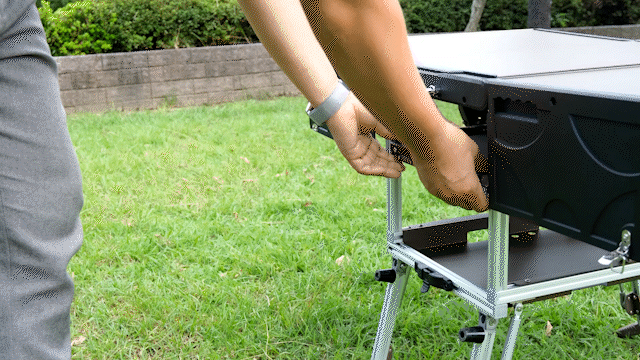 サイドにスライドテーブルが内蔵されていますので、横に引き出して脚を下に広げて固定できます。