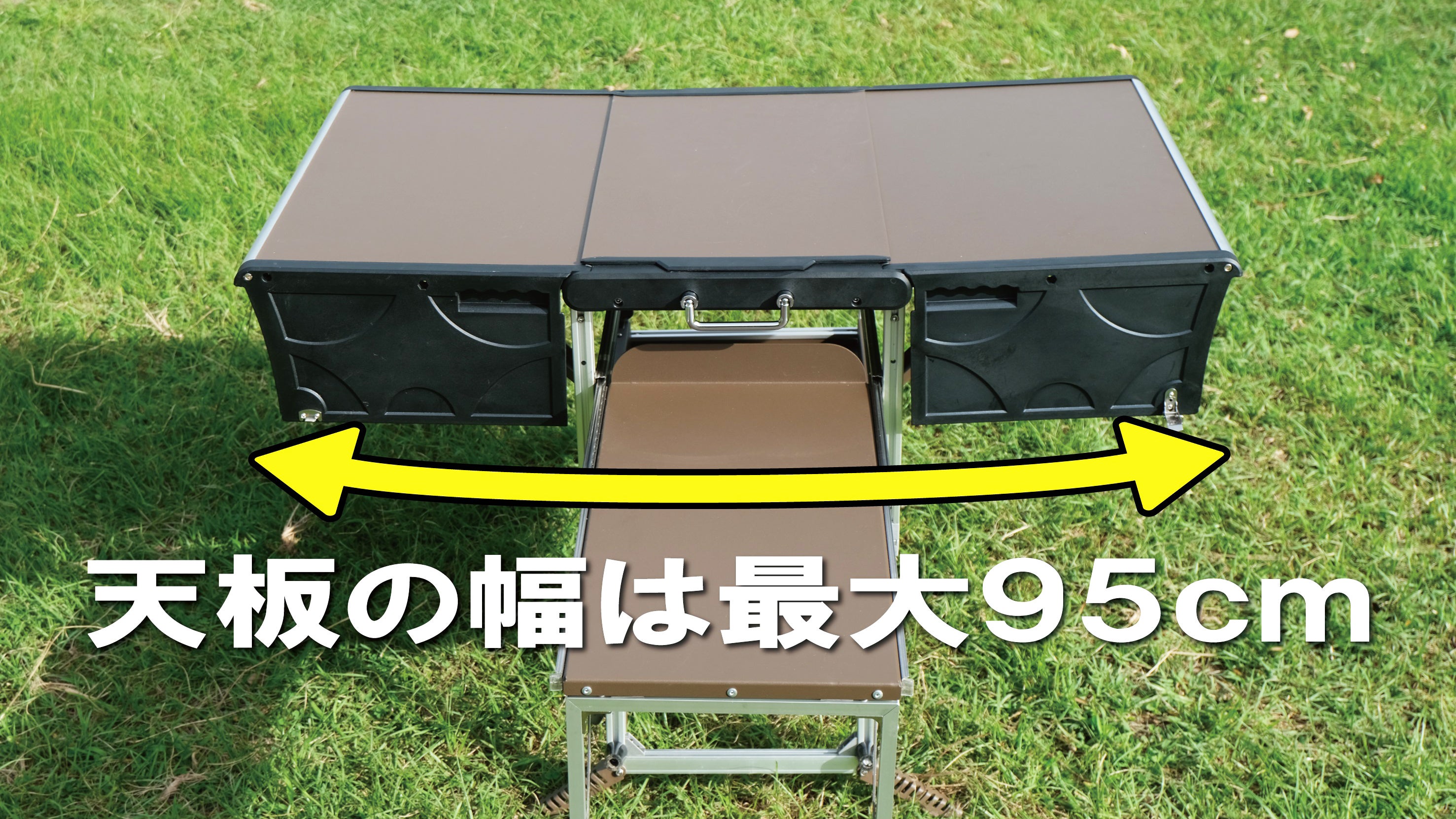 天板を開いた時の幅は95cmございますので、4人での使用で十分なスペースを一瞬で作り出せます。