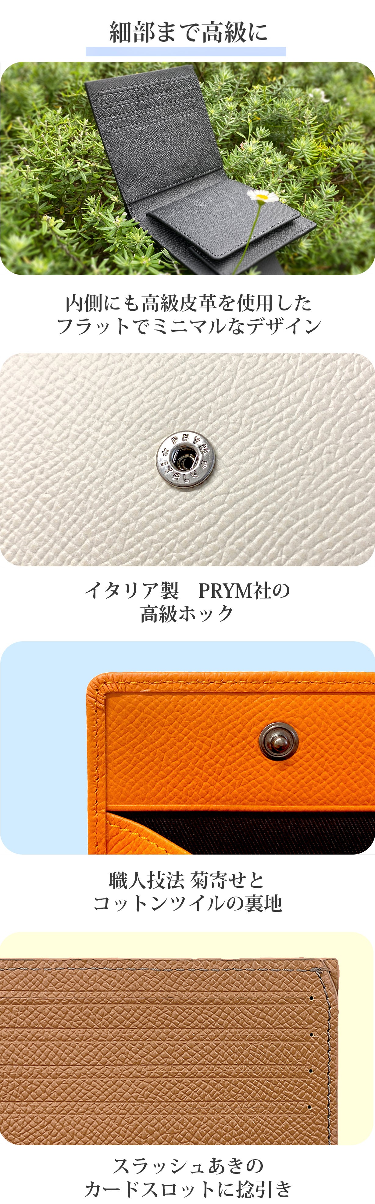 スラッシュタイプのカードスロットは、見た目にもミニマルですっきりと美しいだけでなく、お財布全体の厚みを薄くする手助けもしています。また、高級革小物に使われる捻引きや菊寄せという手法によって、全体的に高級感がある引き締まった印象となっています。