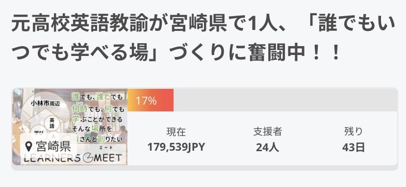 おはようございます!!昨日の夜に公開させていただいたばかりですが、早くも15万円を超える支援を、24名の方からいただいております。本当にありがとうございます!また、支援者の皆様のコメントの一言一言にも、励ましと、笑いを頂いております。皆様の温かいご支援、応援をしっかりと受け止めて活動していきますので今後ともよろしくお願いします。現在は、地域外の方からのご支援が多く、委託希望も多数いただいております。ありがとうございます!ぜひ地域の皆様も興味を持っていただけたら、ご協力よろしくお願いいたします。Learners Meet代表 原田 英治※公開ページの活動開始日が2021年7月となっておりますが、正しくは2020年7月です。修正申請はしましたが、反映されるのは13日(月)頃になるかと思います。この場を借りてお詫びと訂正とさせていただきます。※リターンの②について強み分析について、「備考欄では書ききれない」という問い合わせをいただいております。お手数ですが、備考欄に書ききれない場合は、直接lmkobayashi2020@gmail.com宛てにメールでお送りいただければ幸いです。できるだけ情報を書いていただいた上で、精一杯メッセージ書かせていただこうと思いますのでよろしくお願いいたします。