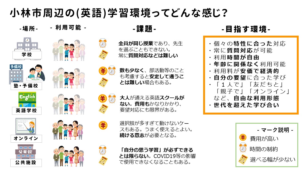 上の図の通り、既存の学習施設の多くは年齢や立場による利用制限がかかる、もしくは金銭面で高額になっており、利用できる人や家庭が限定されてしまうのが現状です。