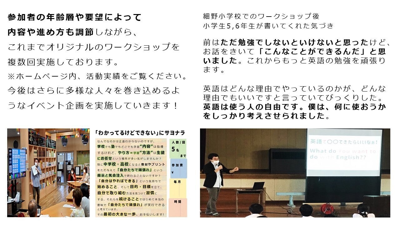今回のクラウドファンディングを実施後、COVID19の状況にも左右されますが、②を満たすために無料で参加できる英語活動のイベントを実施していく予定です。