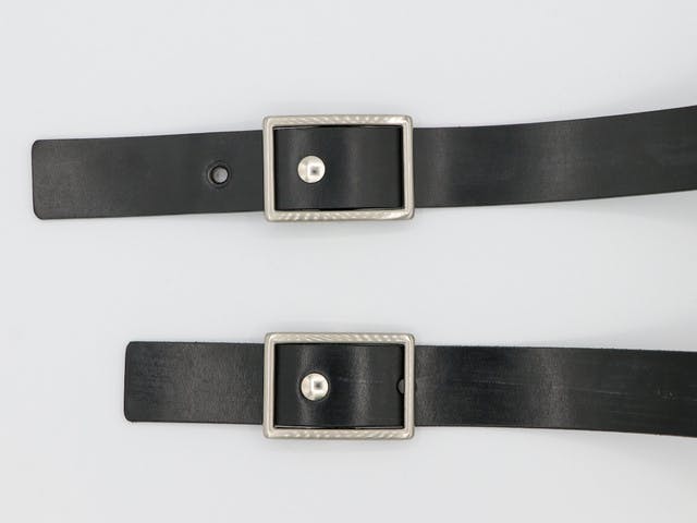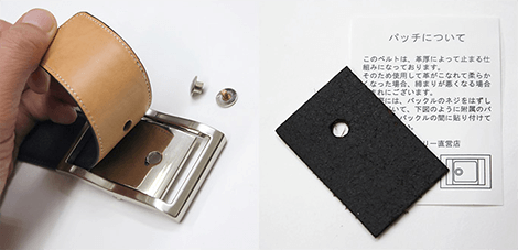 付属のパッチを革とバックルの間に貼り付けて使用してください。