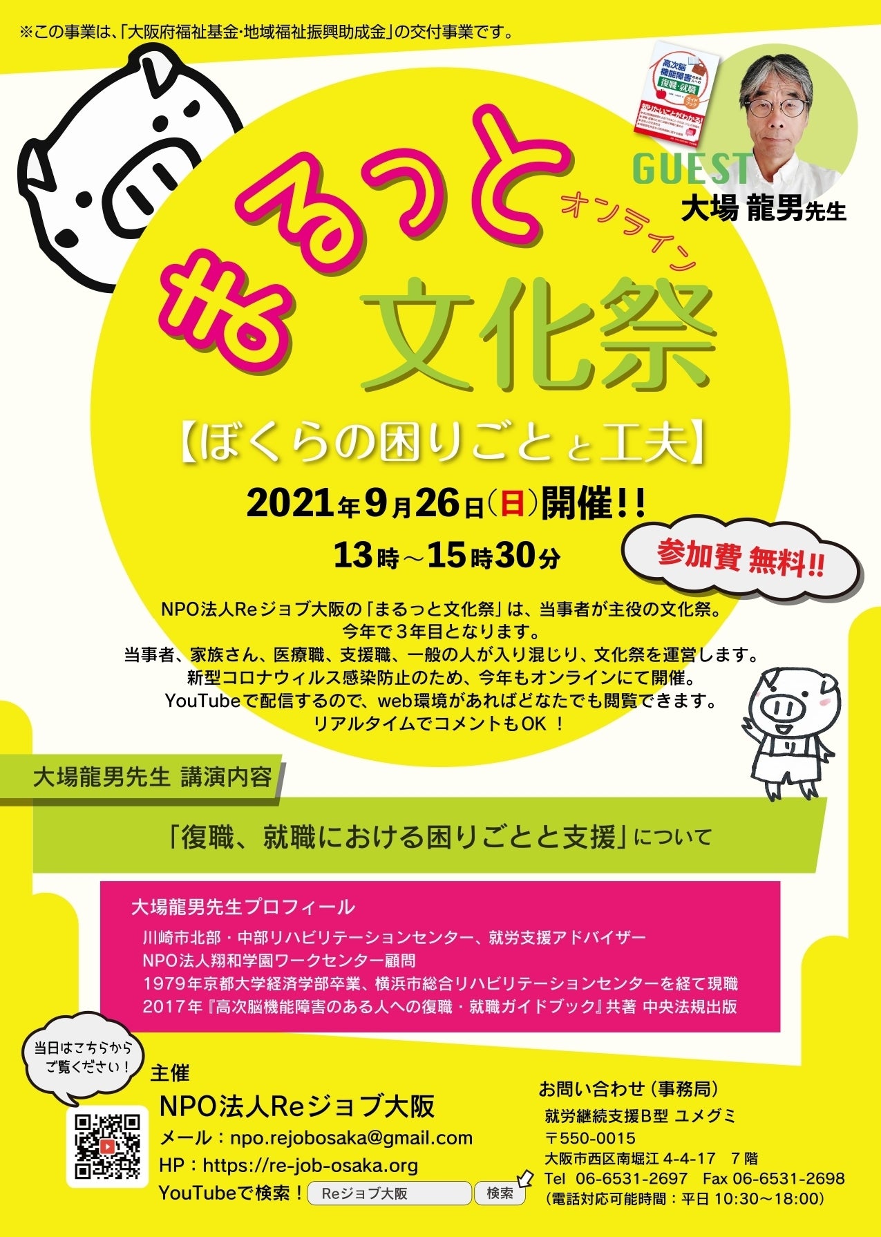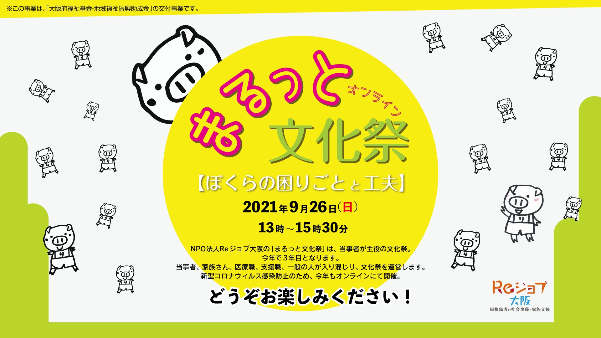 NPO法人Reジョブ大阪の「まるっと文化祭」は、当事者が主役の文化祭。今年で3年目となります。当事者、家族さん、医療職、支援職、一般の人が入り混じり、文化祭を運営します。新型コロナウィルス感染防止のため、今年もオンラインにて開催。YouTubeで配信するのでweb環境があればどなたでも閲覧できます。リアルタイムでコメントもOK!