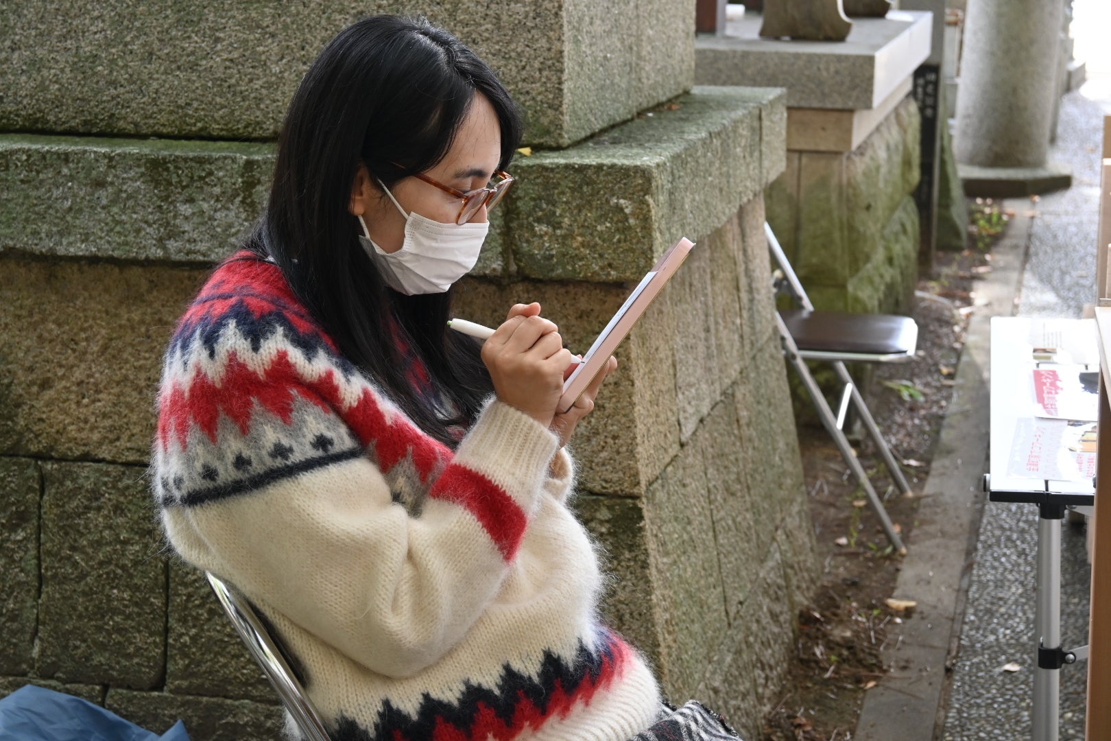 ラジオパーソナリティの松岡理恵さんは、メガネをかけてお忍び参加というスタイルで、石川本読まん会ね。メンバーと共に屋台を出店。場を盛り上げてくださいました。