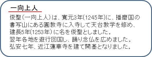 鎌倉時代、弘安7年(1284年)に一向上人が近江へ布教に訪れた際、地元の豪族の土肥三郎元頼が帰依し建立したものです。
