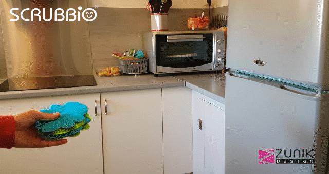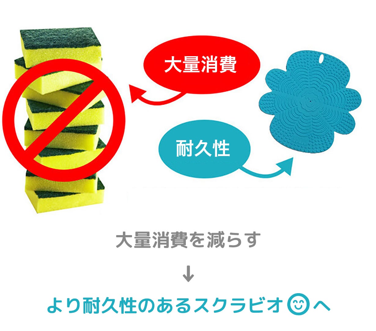 キッチンやバスルームには、あまりにも同じようなアイテムがあり、使っては捨てての家庭用スポンジが自然破壊の大きな原因。地球環境を守るためには日用品の生産量と大量消費を減らさなければいけません。その結果、1枚何役分の耐久性ある製品が必要と考え、この度スクラビオが誕生しました。
