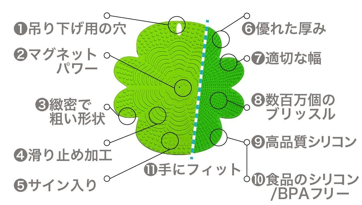 また最新の強力なネオジム磁石をシリコンに内包。ほとんどの金属面にスクラビオを張り付けたり「吊り下げ用の穴」でフックに掛けることも出来ます。