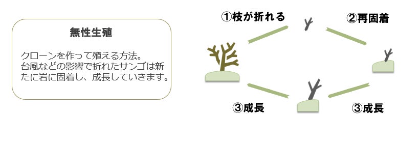 無性生殖で植える養殖は、折れたサンゴが新たに岩に固着し成長していくという無性生殖の性質を利用する養殖方法であり、全部で5つの工程で行われます。