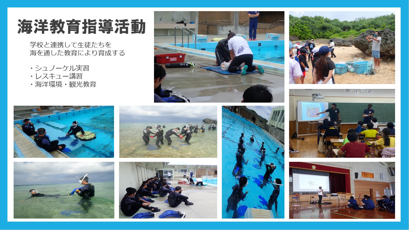 他にも高校生へのシュノーケル実習や専門学校の生徒への海洋観光の授業など、沖縄の子供たちへの授業を多数行っています。