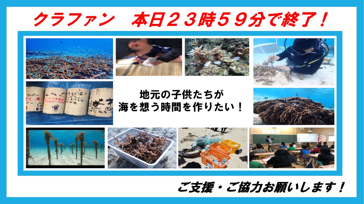 【クラウドファンディング ラスト7時間!】はいさい!ダイビングショップナチュラルブルーです。ついにクラウドファンディング終了まであと7時間となります。本日10月10日23時59分で終了です。多大なるご支援・ご協力、本当にありがとうございます。現在の支援状況・支援者数 37名・支援金額 227,500円・達成率 113%先日もお伝えさせて頂きましたが、皆様に沢山のご支援・ご協力いただき無事目標金額を達成しています。本当にありがとうございます。ですが、セカンドゴールの達成率が4%です。。。スタートした日から皆さんにはお願いばかりの日々で大変恐縮ですが、あと少しだけご支援・ご協力をお願い致します。 こちらの投稿に「いいね」をおしていただいたり、SNSでのシェア、ご家族やお友達・関心のありそうなお知り合いの方に、当プロジェクトについてご紹介いただければ幸いです。最後まで、どうか応援よろしくお願いします!ナチュラルブルー スタッフ一同