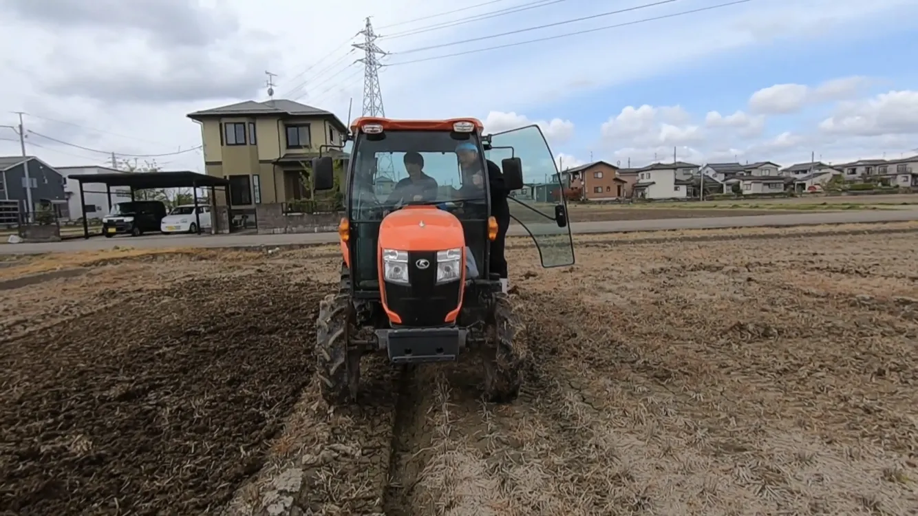 圃場内でトラクターの操作方法を指南してもらう
