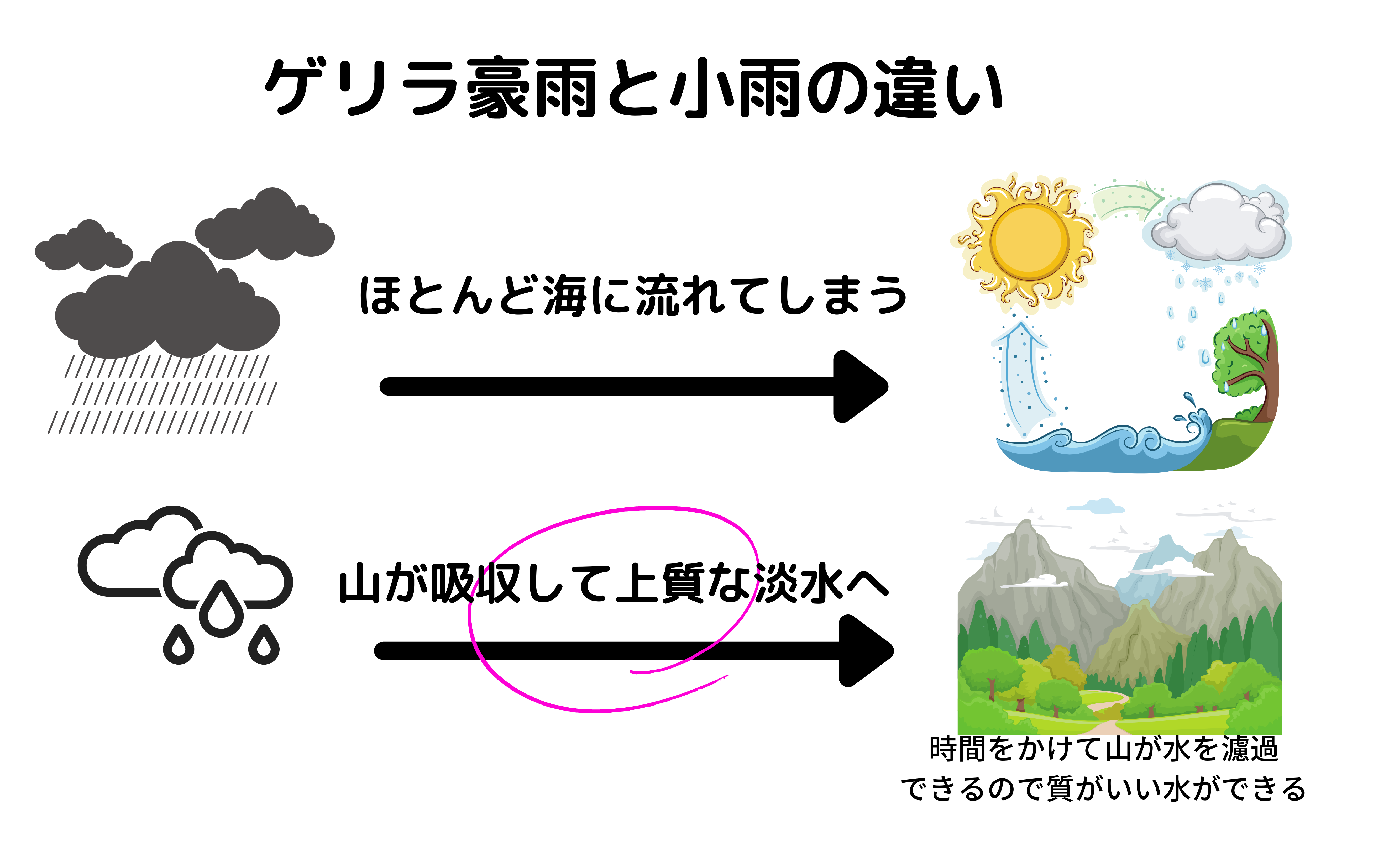 ゲリラ豪雨が増え続ければ、天然水は減少します。