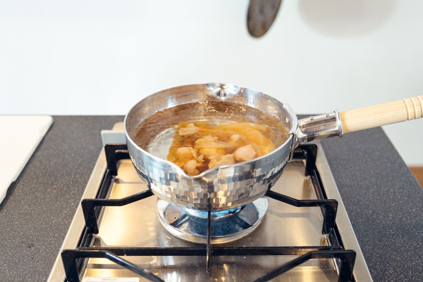 ④親子鍋を火をかけ、湯煎をした「親子丼の素」を中火で沸騰するまで温める