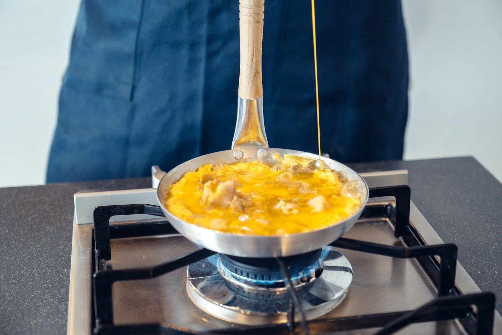⑥6割程度卵が固まりはじめたら、残りの⅓1/3の卵を流し入れ火を止めて蓋をし1分ほど放置。余熱を使ってじんわりと火を通していきましょう。