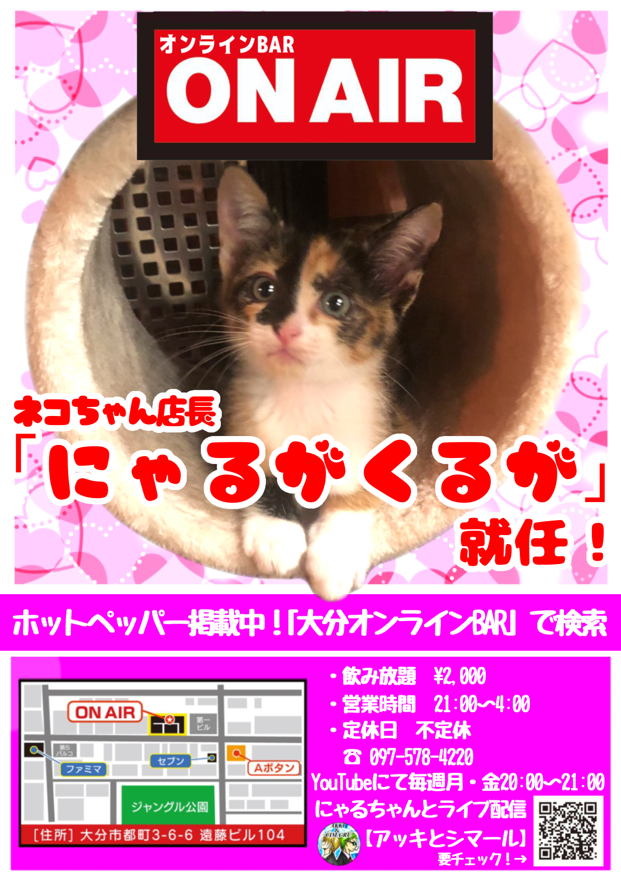 オンラインBAR【ON AIR】では皆様にYouTubeを通じてコロナ禍の中でも楽しさをお届けしたいと思っています。ネコちゃん店長とスタッフ、このお店を守っていく為に皆様のお力添えをお願い致します!