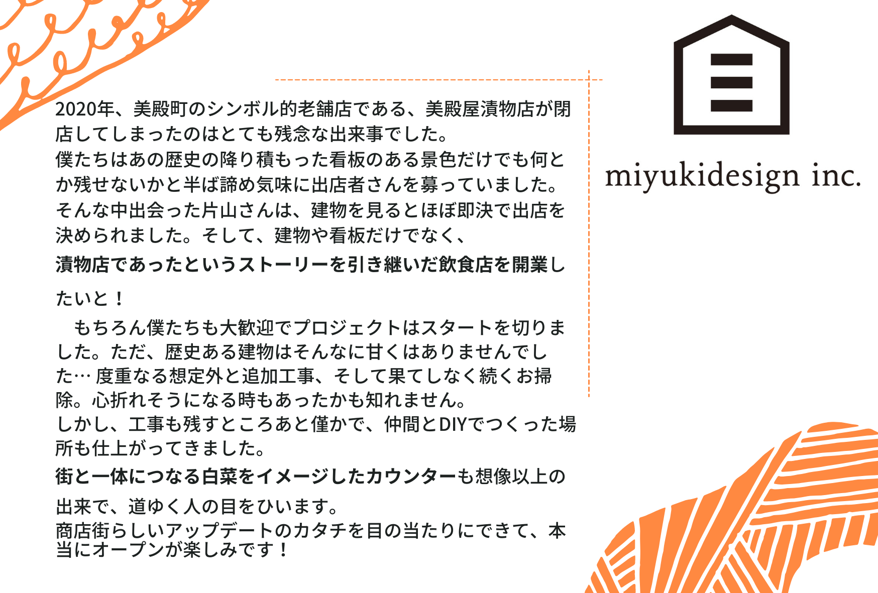 僕が取り組むのは、戦後から続いていた漬物屋さんの文化を継承し、商店街に新たな空間を作ります。