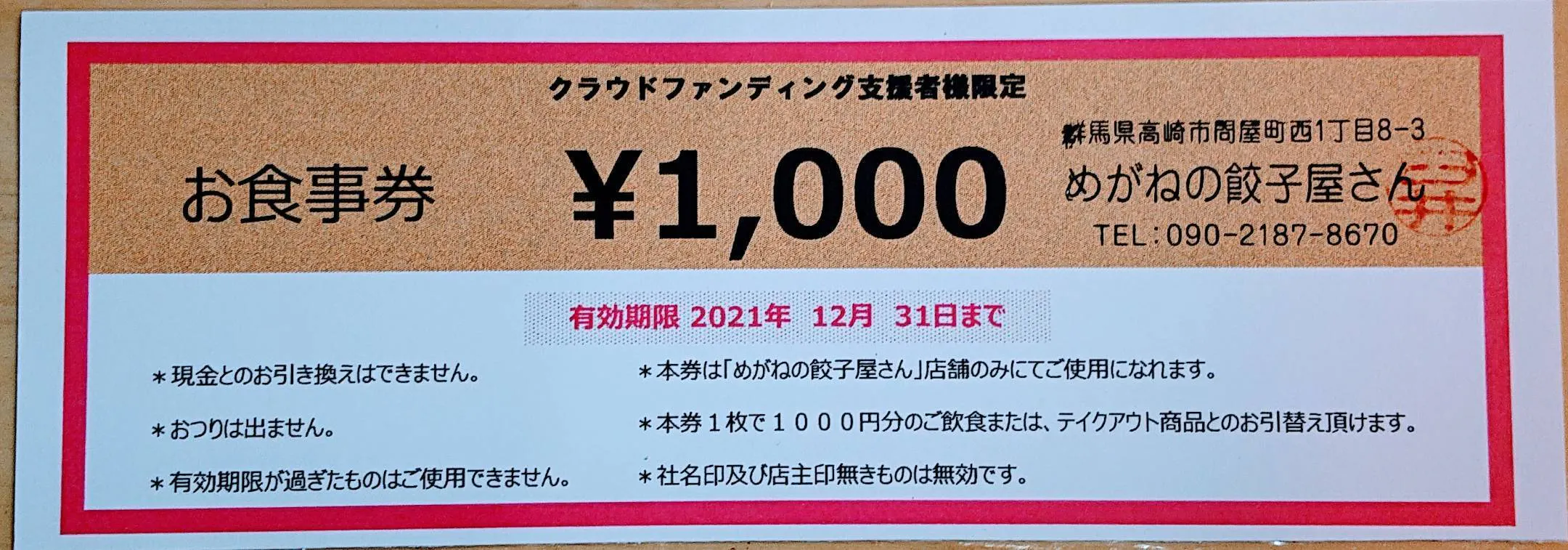 めがねの餃子屋の店舗のみでご利用頂けます。