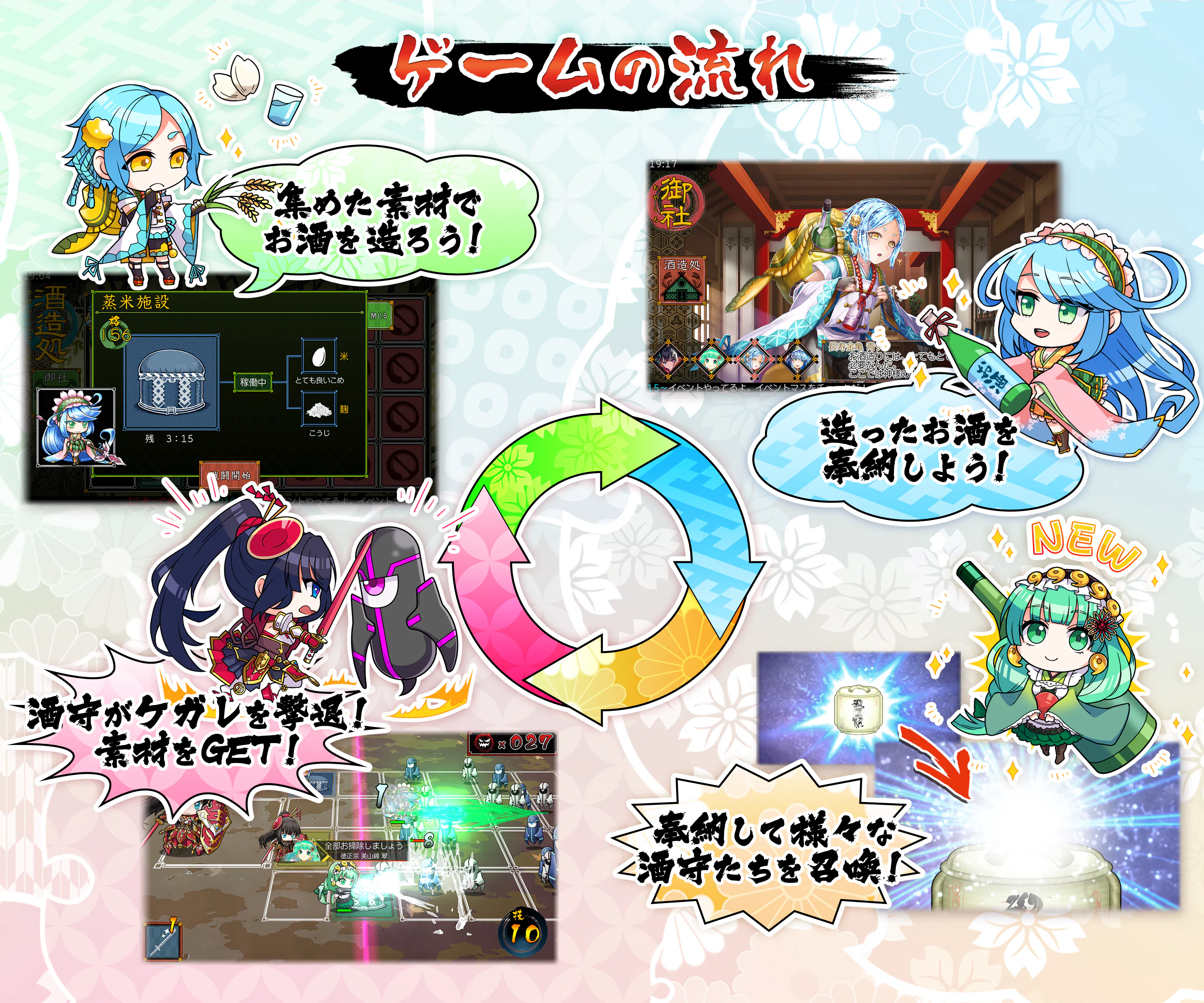 集めた『素材』を使って『お酒』を造り、『奉納』する事で『酒守』が誕生します。
