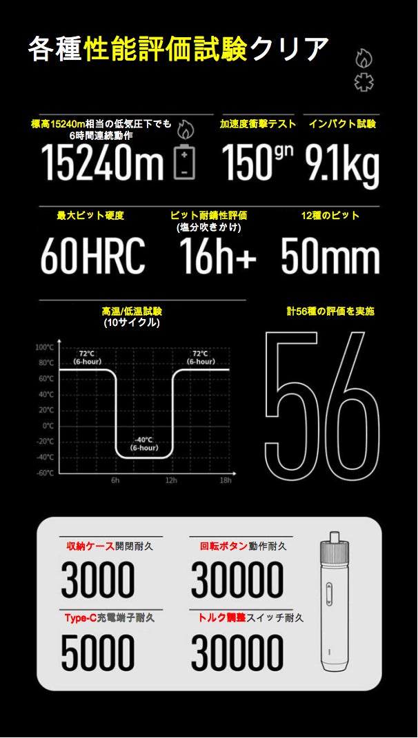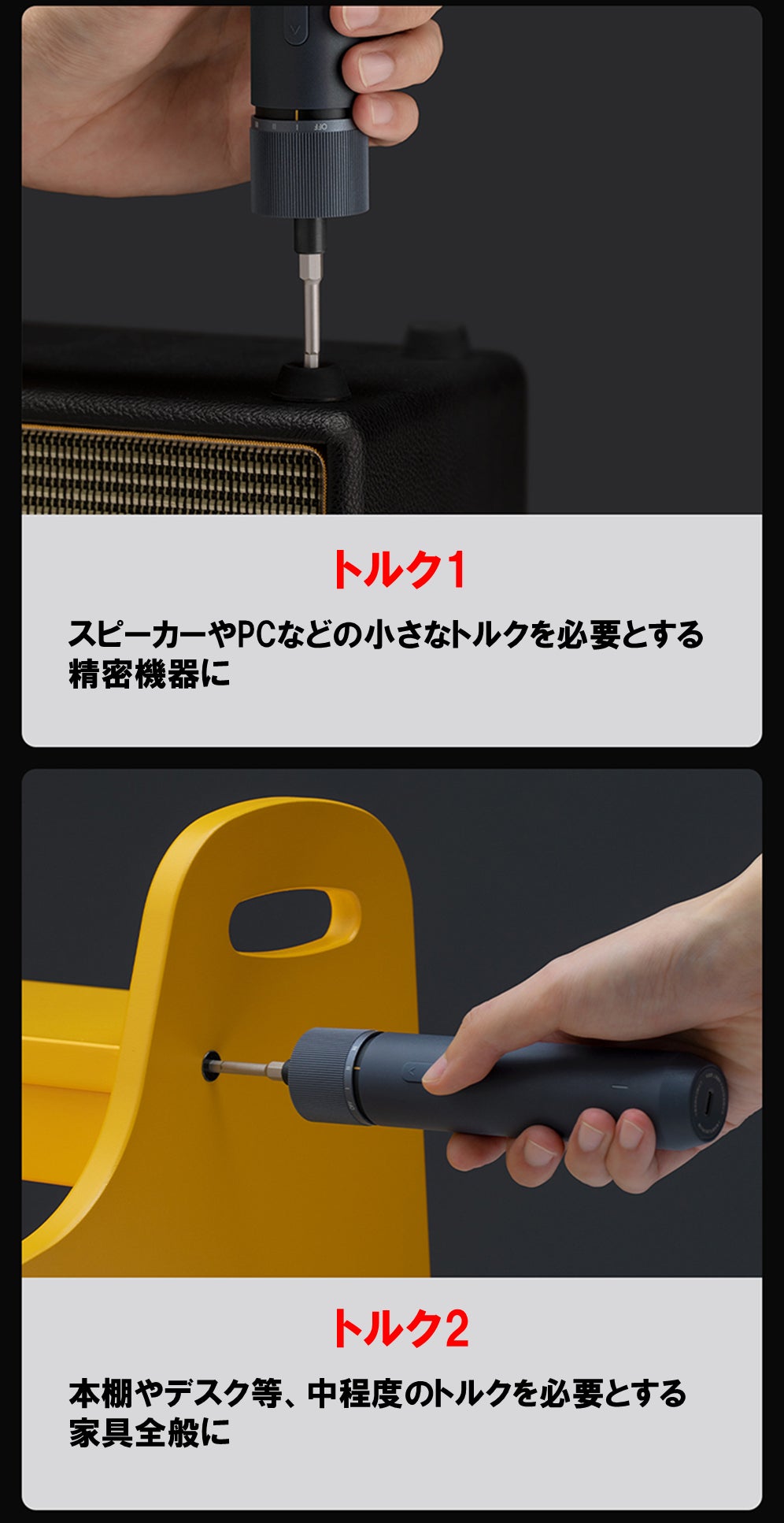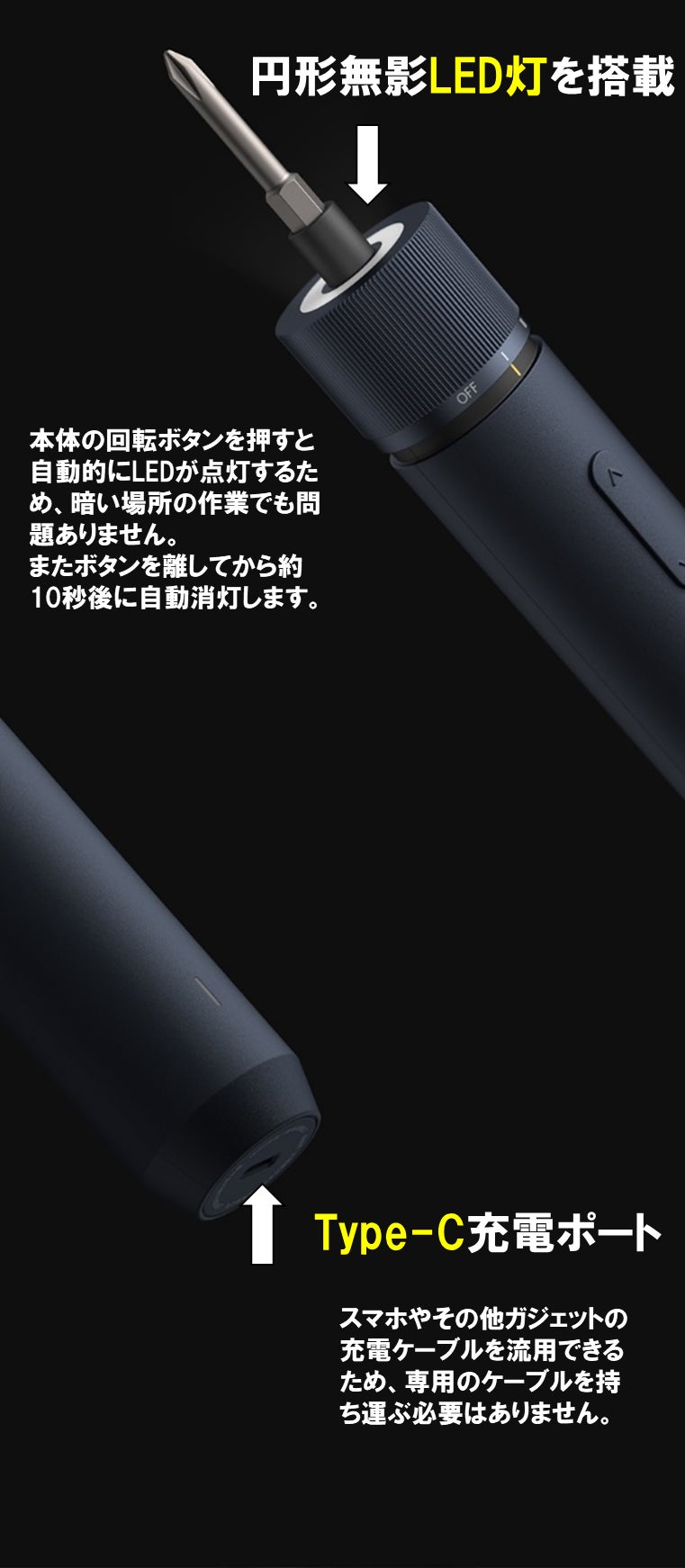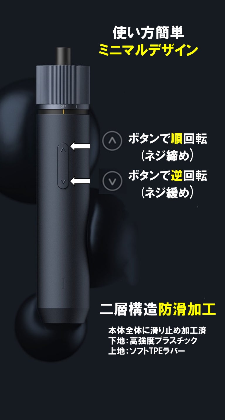 - またドライバー本体は約250gと軽量で、高強度のプラスチックと柔らかいTPEゴムの2重構造の滑り止めグリップにより、片手でしっかりと操作できます。